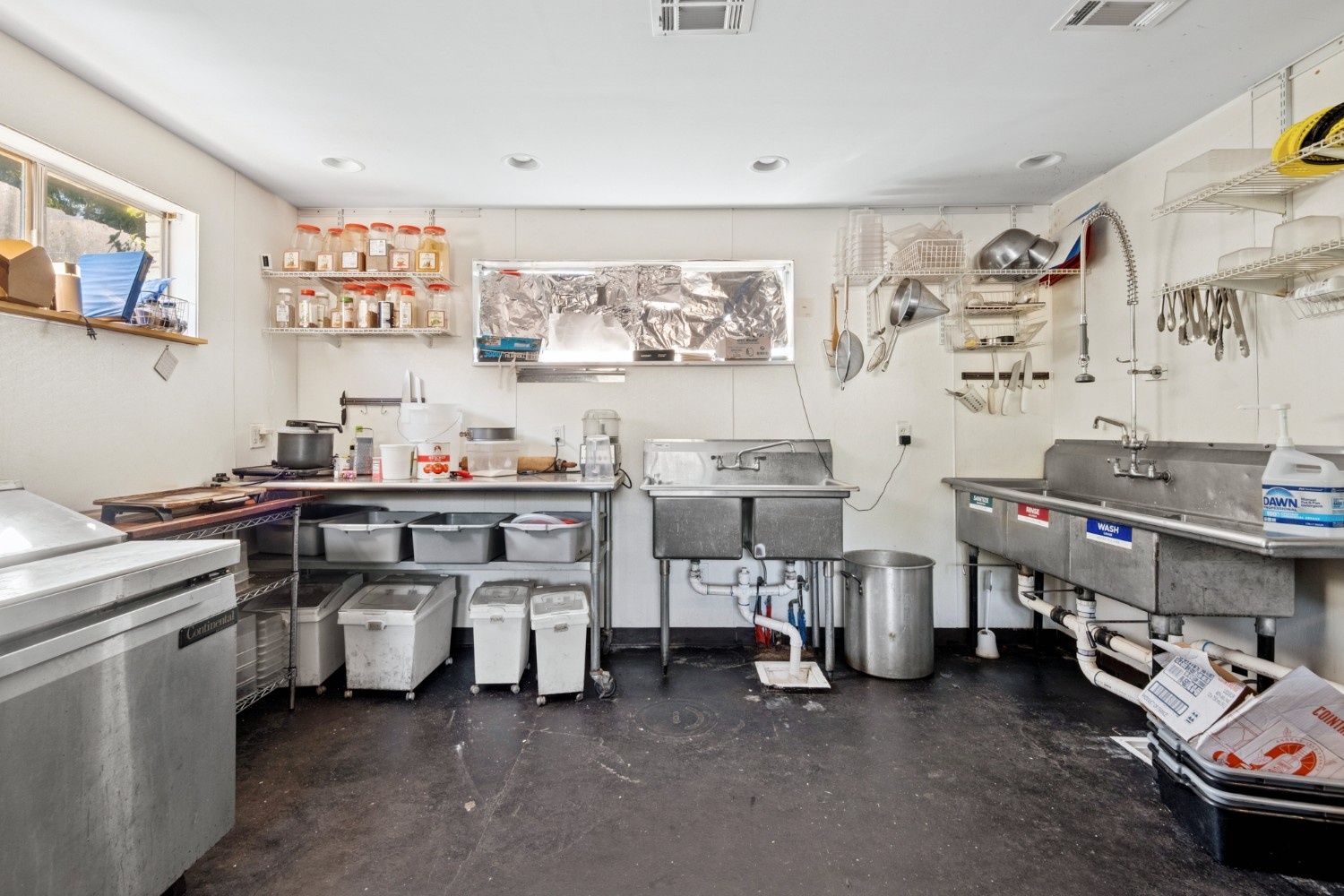 The space features a built-out bar, spacious dining area, and a complete commercial kitchen with hood, three-compartment sink, grease trap, and related infrastructure. An upstairs office/private dining/storage area provides additional flexibility. The expansive lot allows for parking or outdoor dining, creating unique possibilities for an operator to activate both indoor and outdoor experiences.