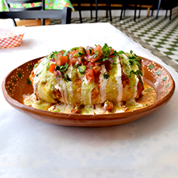 Slow roasted pork shoulder, scrambled eggs, crispy potatoes, chihuahua cheese and pinto beans wrapped in a huge flour tortilla smothered in salsa ranchera, crema, and